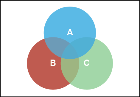 فيما يلي لدينا شكل ڤن-Venndiagram فيه ثلاثة دوائر تمثل المجموعات , و, وجميعها متداخلها مع بعضها البعض وتُشكل سبعة مناطق مختلفة: