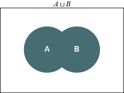 - اتحاد المجموعتين و هو المجموعة التي تحتوي على جميع العناصر الموجودة في أو أو كليهما. يتم تمثيل هذه المجموعة في شكل ڤن-Venndiagram بالمنطقة التي تحتوي على الدائرتين و معاً: