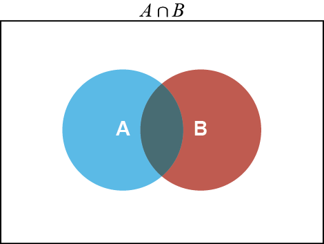 - تقاطع المجموعتين و هو المجموعة التي تحتوي على جميع العناصر الموجودة في كل من و . ويتم تمثيل هذه المجموعة في شكل ڤن-Venndiagram بالمنطقة التي يتداخل فيها الدائرتين و مع بعضهما البعض: