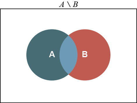 - الفرق بين المجموعتين و هو المجموعة التي تحتوي على جميع العناصر التي تنتمي الى ولا تنتمي الى . ويتم تمثيل هذه المجموعة في شكل ڤن-Venndiagram بمنطقة الدائرة التي لا تتداخل مع الدائرة :